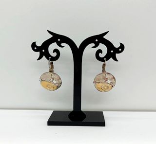 Pendientes redondos con 2 zonas. En la zona amarilla hay una espiral y en el resto parece una fragmentación del material unido por brillitos. No se ponen feos. Cierre de presión. De regalo si compras algo de más de 5 euros de mi perfil.