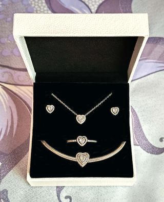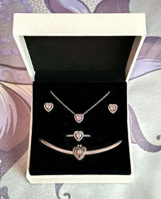Conjunto de plata con diseño de corazón rosa. Incluye: pendientes, collar, anillo, charm y pulsera. - Pendientes con cierre de botón. 12€. - Collar de 22 cm con cierre de mosquetón y ajustable a 2 longitudes. 15€. - Anillo talla: 14 (17,2 mm de diámetro interior, 54 mm circunferencia), 16 (17,8 mm DI, 56 mm C) y 19 (18,8 mm DI, 59 mm C). 15€. - Charm corazón corona. 12€. - Pulsera Corazón de 19 cm de longitud. 15€. Precio unitario. Sólo envío. Si buscas algo y no lo encuentras pregúntame✍️🏼