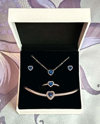 Conjunto de plata con diseño de corazón azul. Incluye: pendientes, collar, anillo, charm y pulsera. - Pendientes con cierre de botón. 12€. - Collar de 24 cm con cierre de mosquetón y ajustable a 3 longitudes. 15€. - Anillo talla: 10 (15,9 mm de diámetro interior, 50 mm circunferencia), 12 (16,5 mm DI, 52 mm C), 14 (17,2 mm DI, 54 mm C), 16 (17,8 mm DI, 56 mm C) y 18 (18,4 mm DI, 58 mm C). 15€. - Charm corazón azul. 15€. - Pulsera Corazón de 19 cm de longitud. 15€. Precio unitario. Sólo envío. Si buscas algo y no lo encuentras pregúntame✍️🏼