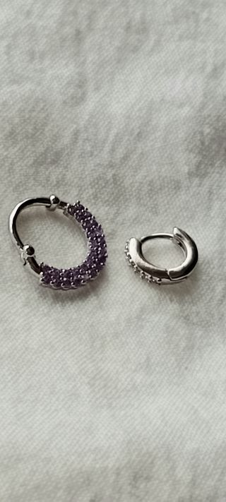 Preciosos pendientes, dos modelos diferentes. Uno con circonitas moradas y otro plateado. El aro pequeño es de plata con circonitas cúbicas El otro es baño de plata con circonitas cúbicas lilas Nuevos No es negociable - Material: Plata 925 - Incluye dos pendientes.