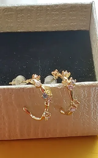 Elegantes pendientes de aro con un diseño delicado y adornados con circonitas cúbicas de colores. Un toque de brillo y color para tu día a día. Nuevos a estrenar, el pincho es de plata - Diseño de semi aro. - Circonitas cúbicas en varios tonos.