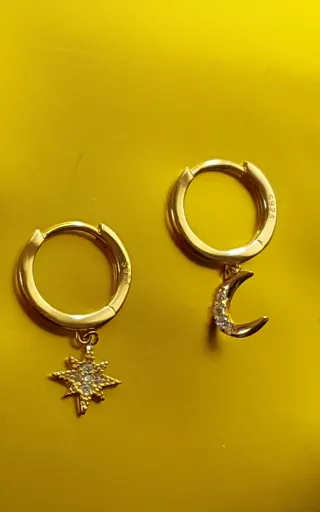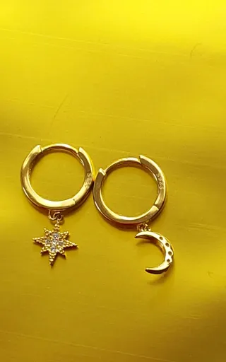 Elegantes pendientes colgantes con diseño de sol y luna. Nuevos a estrenar Plata de ley color dorados y zircón cúbico transparente - Elaborados en plata con baño dorado. - Detalle de circonitas brillantes en ambos colgantes. - Cierre de aro seguro y cómodo.