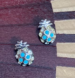 Pendientes en forma de piña tropical con piedrecitas azules y otras brillantes incrustadas. Son de plata. Miden 1,5cm de alto y 1cm de ancho. Cierre botón. Muy veraniegos 🍍