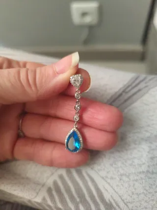 Elegantes pendientes largos con un diseño llamativo. Ideales para fiestas y eventos especiales - Cadena plateada con incrustaciones de pequeñas piedras brillantes. - Colgante en forma de lágrima de color azul intenso. - Cierre de anzuelo seguro y cómodo. - Medida: largo ( 8,5 cms)