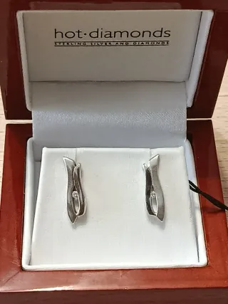 Elegantes pendientes de la marca Hot Diamonds, elaborados en plata y adornados con diamantes. - Diseño moderno y sofisticado. Mate y brillo - Cierre de presión - Nuevo con etiqueta, certificado y estuche original.