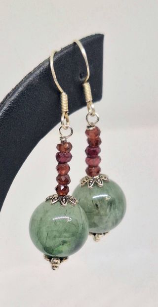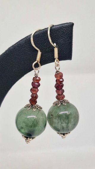 Pendientes de plata 925 con jade verde 13 mm + granate (4,5 cm) Descripción: Pendientes con jade verde natural (bola 13 mm aprox.) y cuentas de granate facetado. Ganchos de plata de ley 925. Largo: 4,5 cm aprox. Muy bonitos.