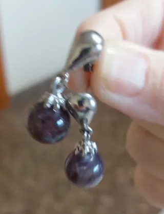 Elegantes pendientes con un diseño único. - Cuentan con cuentas esféricas de color morado. - Los detalles metálicos son de color plateado.