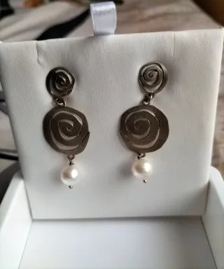 Pendientes de la marca Lotus con diseño en espiral y una perla colgante