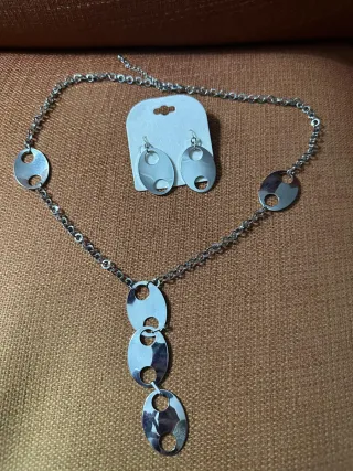 Elegante conjunto de collar y pendientes a juego con un diseño moderno. - Collar con cadena y colgante de tres piezas ovaladas. - Pendientes a juego con forma ovalada. - Acabado plateado.