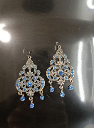 Pendientes de estilo vintage/bohemio con un diseño ornamentado en metal plateado envejecido y detalles de cristales en color azul brillante. Diseño calado con movimiento y pequeñas lágrimas colgantes. Cierre con gancho tipo hippie. Ligeros. Nuevos, sin usar. Se incluye bolsita para guardar o para regalo.
