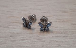 Preciosos pendientes de plata con circonitas cúbicas azules. Son dos pendientes, pequeños y delicados. Ideales para un look elegante y discreto. - Diseño de mariposa. - Material: Plata y circonita cúbica azul natural