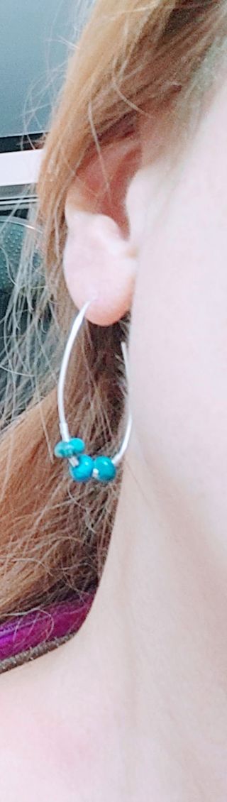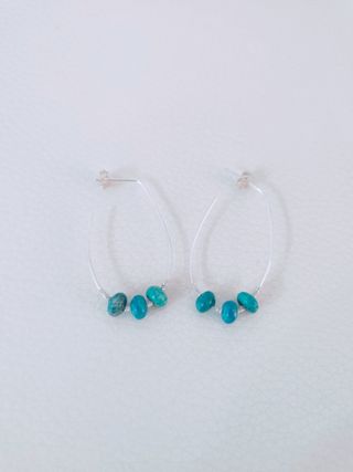 Preciosos pendientes de aro ovalado en plata de ley, adornados con cuentas de turmalina azul y cierre de mariposa para garantizar una sujeción perfecta. Están como nuevos, en perfectas condiciones. Medidas: Alto: 4,5 cm; ancho: 2,3 cm. Si quieres, echa un vistazo a mis otros productos. Si te gusta algo más, puedes hacer un lote y te haré un descuento.