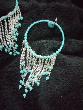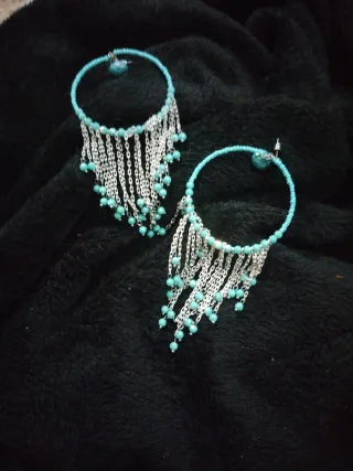 Pendientes de aro grandes con un diseño llamativo. - Cuentan con cuentas de turquesa. - Adornados con cadenas plateadas. - Cierre de presión.
