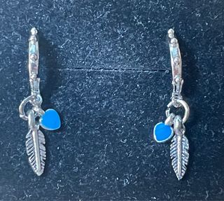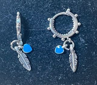 Pendientes de aro con un diseño encantador de pluma y corazón azul. - Cierre de aro. - Detalle de pluma plateada. - Colgante de corazón azul.