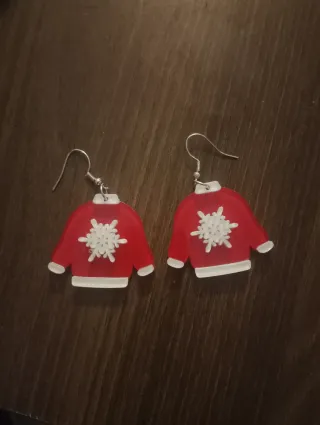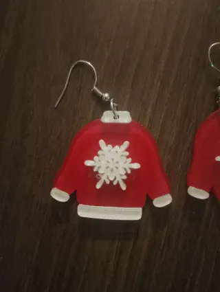 Pendientes con diseño de jersey navideño. - Diseño de jersey rojo con cuello y puños blancos. - Detalle de copo de nieve blanco en el centro. - Cierre de anzuelo plateado.