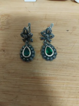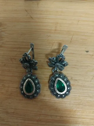 Elegantes pendientes antiguos con un diseño delicado. - Elaborados en plata. - Detalle de pequeñas esmeraldas. - Cierre de presión.
