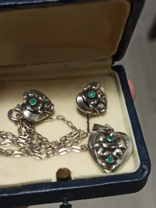 Precioso conjunto antiguo con colgante y pendientes. - Diseño de corazón con flores. - Detalle de pequeñas esmeraldas. - Cadena de plata. - Cierre de mosquetón.