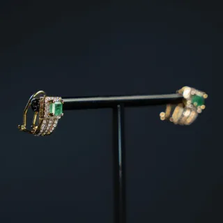 Elegantes pendientes con esmeralda cuadrada. - Diseño en oro. - Piedra central verde esmeralda. - Detalles con pequeñas piedras.