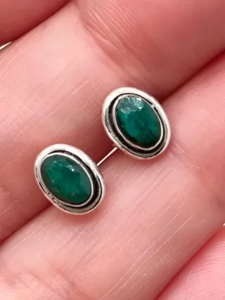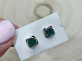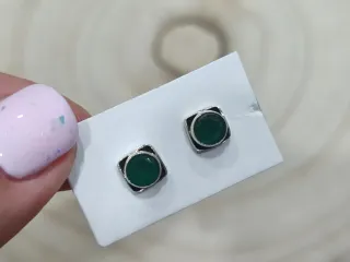 Elegantes pendientes de plata de ley con un diseño cuadrado y una gema central. - Diseño cuadrado con borde. - Gema central de color verde intenso. - Miden aproximadamente 5x5 mm.