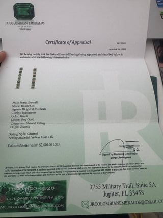 Elegantes pendientes de esmeraldas naturales engastadas en oro amarillo de 14 quilates. Vienen con un certificado de tasación. - Piedra principal: Esmeralda - Corte: Redondo - Peso aproximado: 0.75-Quilates - Claridad: Transparente - Color: Verde - Tratamientos: Natural, Aceitado - Origen: Zambia - Estilo de engaste: Canal - Valor de tasación: $2,490.00 USD