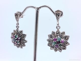 Elegantes pendientes de plata con un diseño floral. Cada pendiente está adornado con una combinación de esmeraldas y rubíes, rodeados por detalles de marcasita que aportan un brillo especial. ref. 599714617 - MEDIDAS : 32 MM DE ALTO - Diseño floral. - Combinación de esmeraldas y rubíes. - Detalles de marcasita.