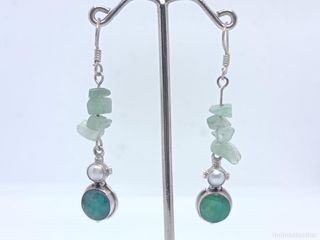 Elegantes pendientes colgantes elaborados en plata, con un diseño único. - Cuentan con una hilera de piedras verdes facetadas. - Detalle de perla blanca. - Colgante principal con esmeralda verde. - Cierre de plata.