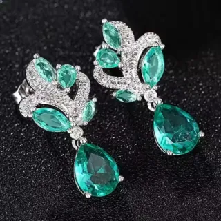 Elegantes pendientes de plata con detalles brillantes y esmeraldas. Artesanal, pieza única. Disponible todo el conjunto - Diseño con forma de lazo. - Colgante con piedra en forma de lágrima. - Acabado detallado en el metal.