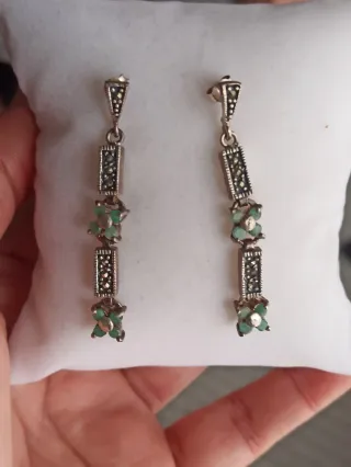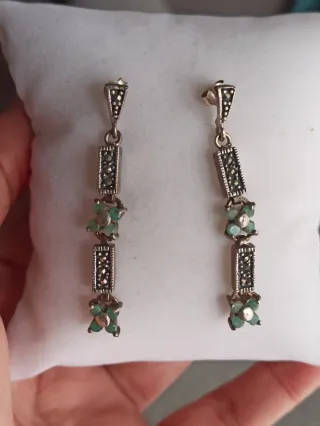 Elegantes pendientes de plata con detalles en marcasita y una hermosa esmeralda central. - Diseño colgante con forma de rombo. - Adornos de marcasita. - Piedra central de esmeralda. - Cierre de presión.
