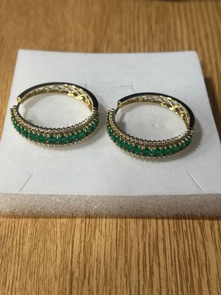 Elegantes aros grandes con un diseño llamativo. Perfectos para añadir un toque de brillo a cualquier atuendo. - Laminado en oro de 14 quilates. - Incrustaciones de piedras verdes rectangulares. - Diseño de argolla.