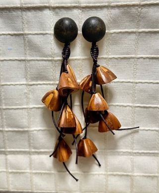 Pendientes largos muy originales elaborados con madera. Piezas enfiladas en cuero encerado. Tonos marronáceos. Como nuevos.