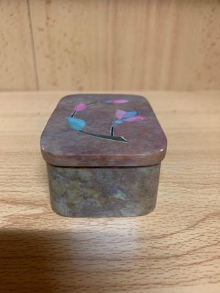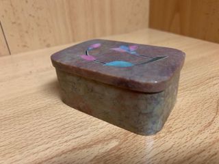Bonita y Pequeña caja decorativa hecha de piedra natural con tapa y decoración en incrustación (stone inlay) con motivo floral en tonos rosados y turquesas en las incrustaciones. Medidas aproximadas 2” x 3” (unos 5 x 7,5 cm). Ideal como joyero pequeño, para anillos, pendientes, recuerdos o decoración. Pieza decorativa artesanal, pesada y sólida. Perfecta para regalo o para amantes de la decoración étnica y natural. Se entrega tal como aparece en las fotos.