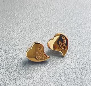 Elegantes pendientes con diseño de corazón y el logo de la marca. - Cierre de mariposa. - Acabado plateado brillante.