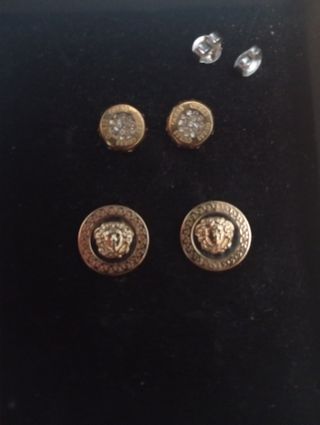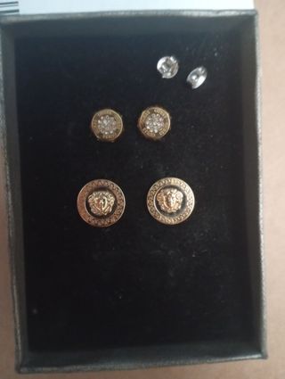 Conjunto de pendientes de la marca Guess y otros Versace originales - Diseño circular con detalles de pedrería. - Un par con el logo de la marca. - Otro par con un diseño inspirado en Medusa.