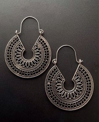 Pendientes de estilo étnico, inspirados en la artesanía de ferias medievales. Su diseño intrincado y su acabado plateado les dan un toque único. - Diseño calado con motivos geométricos y florales. - Cierre de anzuelo para mayor comodidad.