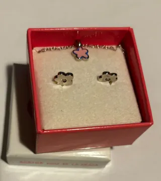 Precioso conjunto de joyería infantil de Agatha Ruiz de la Prada. - Incluye un colgante y dos pendientes. - Diseño de flor con detalles en rosa y plata. - Ideal para añadir un toque de color y alegría.