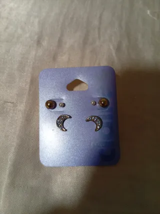 Set de pendientes juveniles con diseños de luna y perlas. - Dos pares de pendientes con forma de luna. - Un par de pendientes de perla. - Cierre de presión. Descuento si se compran varias cosas del perfil.
