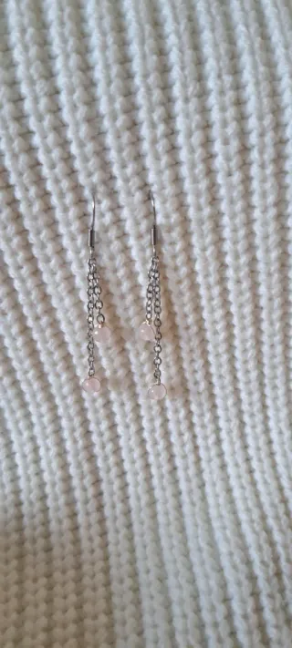 Pendientes Largos de Acero Inoxidable Hipoalergénico con Cuarzo Rosa y Plata -Joyeria energética artesanal - Pieza única artesanal, hechos a mano con mimo y detalle. Estos pendientes largos (anzuelo) elaborados íntegramente en acero inoxidable hipoalergénico, incorporan delicadas cadenitas colgantes del mismo material, que aportan ligereza y movimiento. Se completan con finas bolitas de cuarzo rosa engarzadas en plata, creando un diseño que transmite una sensación de dulzura y bienestar. 💗 Detalles: Pendientes largos Acero inoxidable hipoalergénico Cierre tipo anzuelo y tapón de seguridad Cadenitas también en acero hipoalergénico