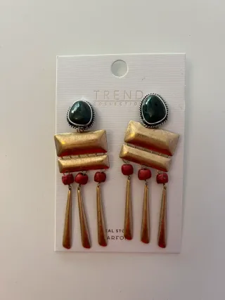 Pendientes largos con diseño geométrico y detalles en piedra. - Acabado dorado mate. - Piedra central de color verde oscuro. - Cuentas rojas. - Cuelgan tres piezas cónicas doradas.