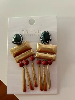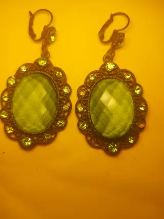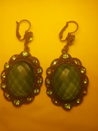 Elegantes pendientes largos de estilo vintage. Un accesorio llamativo con un diseño detallado.a uno de ellos le falta 2 piedras Pero puestos ni se nota - Diseño ovalado con piedra central verde. - Marco ornamentado con pequeñas incrustaciones. - Cierre de gancho seguro.