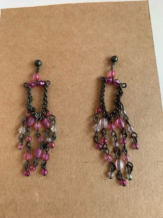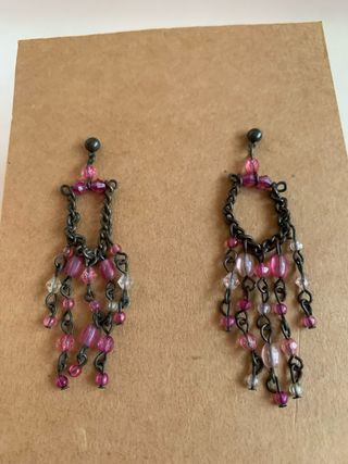Pendientes largos estilo cascada de cuentas Elegantes pendientes con cuentas de cristal en tonos rosas y transparentes, colgando de una delicada cadena dorada. Perfectos para añadir un toque especial a tu look. • Cuentas de cristal en tonos rosas y transparentes. • Cadena fina de metal dorado. • Cierre de presión seguro y cómodo