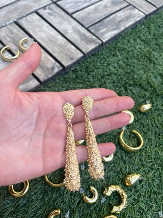 Pendientes largos con un diseño texturizado y llamativo. - Acabado en tono dorado. - Diseño colgante. - Textura granulada.