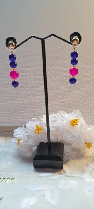 Pendientes largos con un diseño llamativo y elegante. Bisutería fina - Cuentan con cuentas de color azul y fucsia. - Cierre seguro para llevarlos cómodamente.
