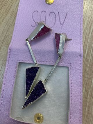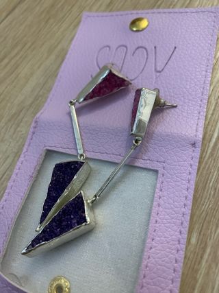 Elegantes pendientes largos con un diseño único. - Detalle de piedras en tonos morados y rosados. - Montura metálica plateada. - Cierre de presión.