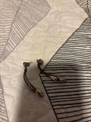 Elegantes pendientes largos con un diseño moderno. - Cuelgan de un cordón fino. - Cuentan con detalles metálicos plateados. - El cordón es de color marrón.