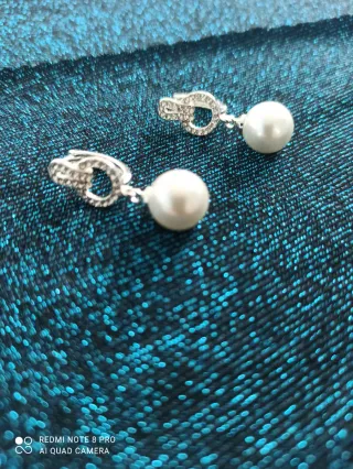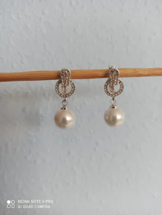 Elegantes pendientes con perlas de cristal y detalles plateados. - Diseño con perla colgante. - Adornos de cristal en la parte superior.Miden 2,4 cm de largo. NO negociable.