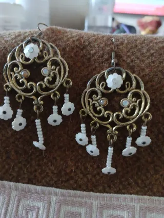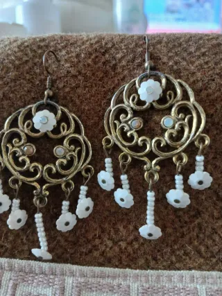 Pendientes largos de fantasía con un diseño elegante. - Detalle de flores blancas. - Pequeños adornos de pedrería. - Cierre de anzuelo.