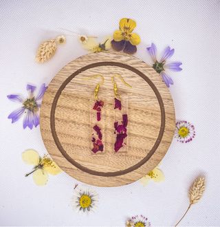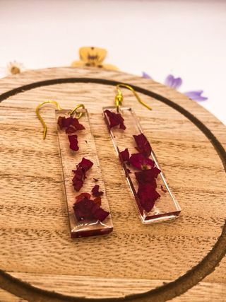 Pendientes largos con delicadas flores rosas preservadas en su interior. Un accesorio único y elegante. - Diseño alargado y rectangular. - Flores secas de color rosa intenso. - Cierre de anzuelo dorado.