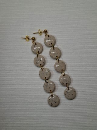 Pendientes de bolitas largos de color piedra. De arcilla polimerica y cierres de acero inoxidable de color dorado. Mide 7,5cm aprox de largo.