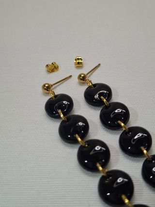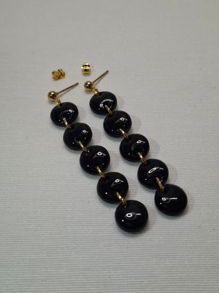 Pendientes largos con cuentas de color negro de arcilla polimérica y cierres de acero inoxidable en color dorado. No pesan. - Cuentas redondas y brillantes. - Cierre de presión.