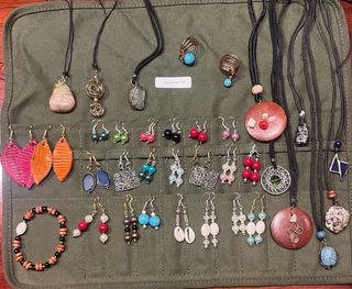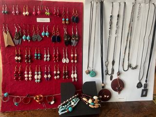bisutería fina un par de pendientes o colgante - Collar con colgante de piedra azul y alambre dorado. - Pendientes largos con perlas y detalles plateados. - Pendientes cortos con perlas y detalles dorados. Precio por par de pendientes o por un colgante. Recoger en Barcelona